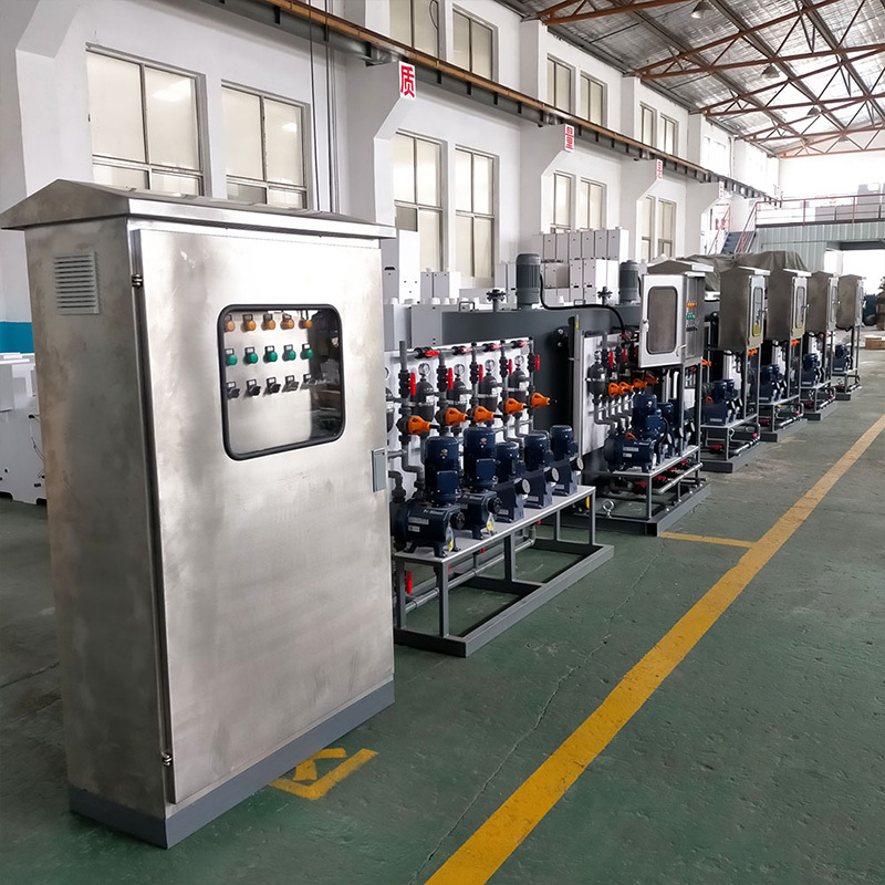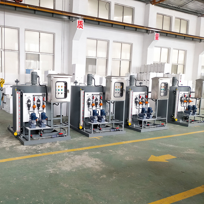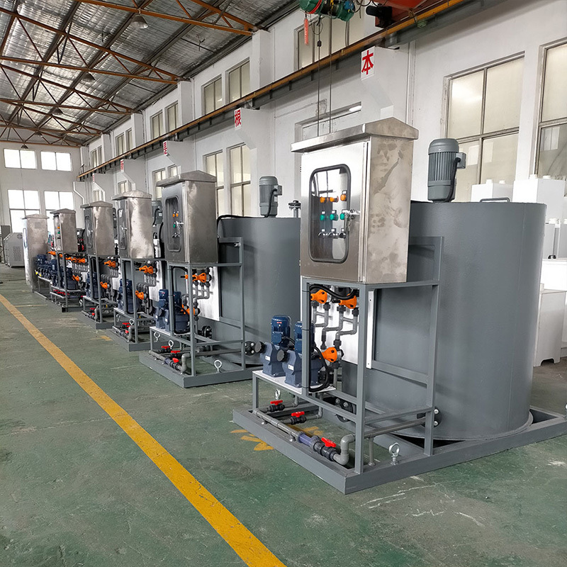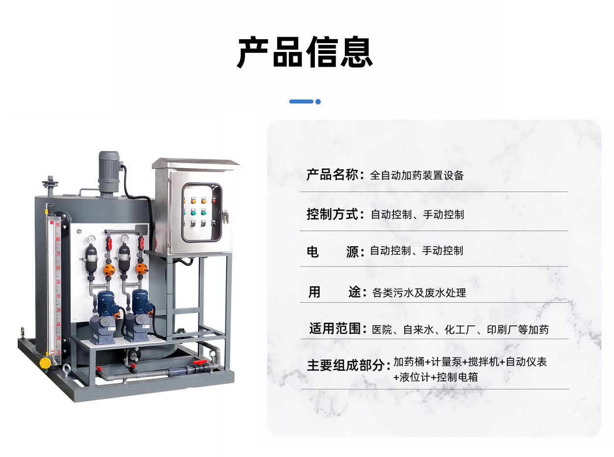 加藥裝置通過(guò)不同的配置,精確配置各類(lèi)固體和液體的化學(xué)藥品的溶液,再用計(jì)量泵準(zhǔn)確投加,以達(dá)到各種設(shè)計(jì)要求。