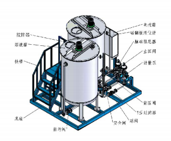 加藥裝置是以計(jì)量泵為主要投加設(shè)備,將溶藥箱、攪拌器、液位計(jì)、安全閥、止回閥、壓力表、過(guò)濾器、緩沖器、管路、閥門(mén)、底座、扶梯、自動(dòng)監(jiān)視系統(tǒng)、電力控制系統(tǒng)等按工藝流程需要組裝形成一個(gè)模塊,即所謂的撬裝式組合單元。